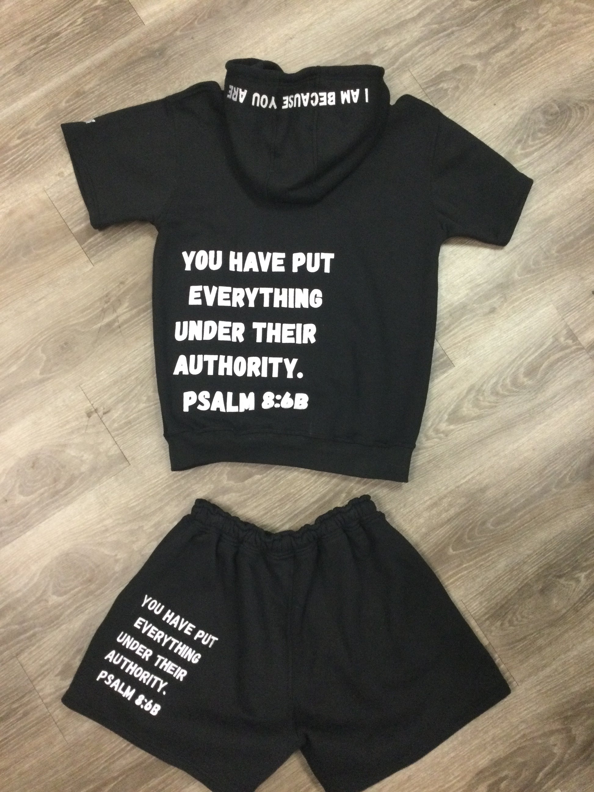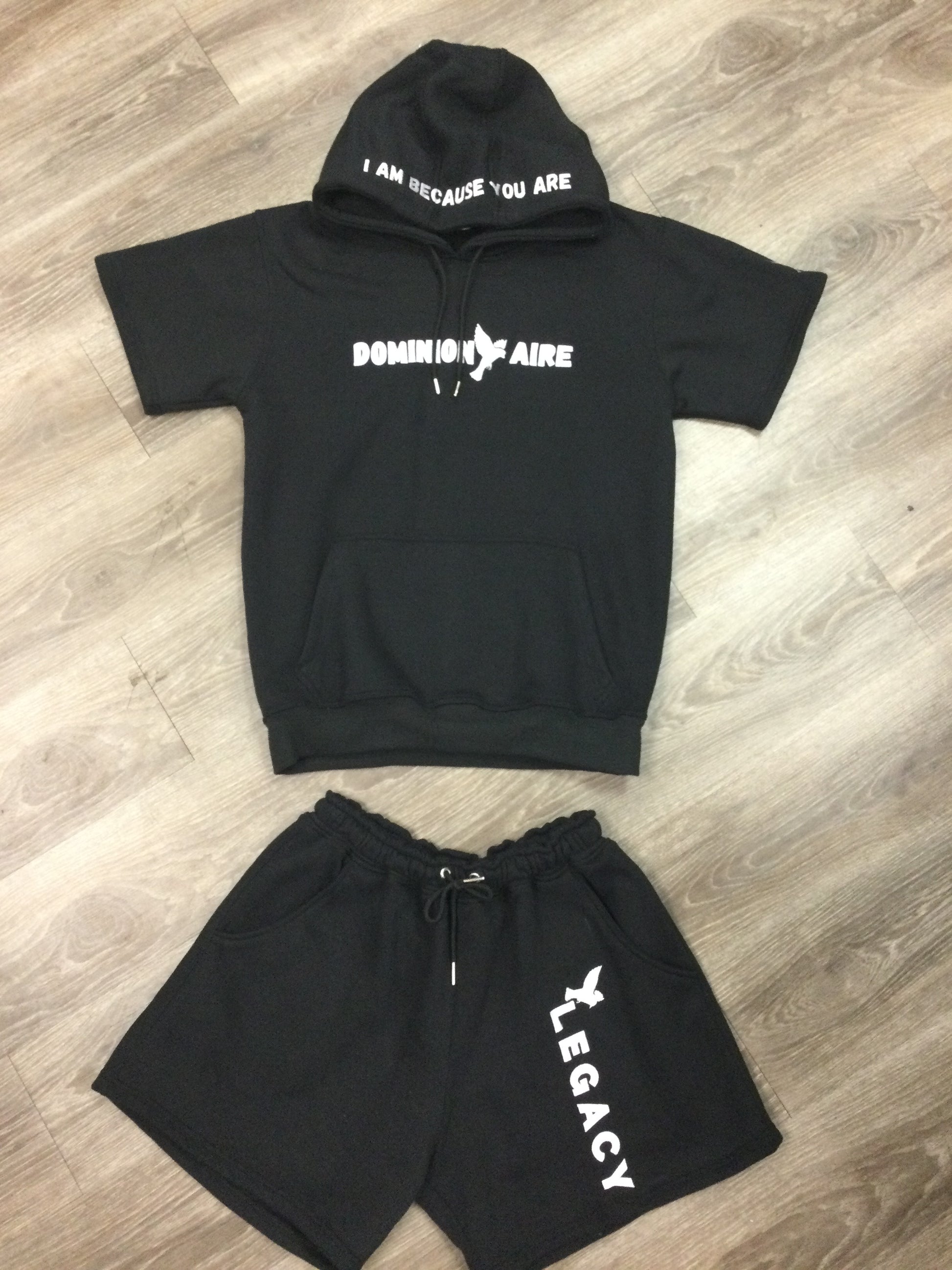 This cotton fleece outfit features a short-sleeve hoodie and shorts, both in a vibrant blue color. The front of the hoodie is emblazoned with the word "DOMINION-AIRE" and the shorts have the word "LEGACY" printed down one leg. The ensemble has a sporty and comfortable look, perfect for casual wear. On the back, the outfit includes the scripture "Psalm 8:6," adding a spiritual and motivational element to the attire.